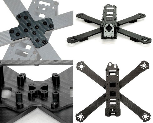 HighEnd 3K Cabonframe mit 4 mm Auslegern, Bodenverstärkungsplatte, Neopren Landefüssen, Antennenhalterung, Kamerahalterung. Die speziellen Aluminium Halterungen dienen zur gleichzeitigen Befestigung von Auslegern und Elektronik. Ein Ausleger kann innert Sekunden durch das Lösen von 3 Schrauben gewechselt werden ohne das der Frame zerlegt werden muss.
