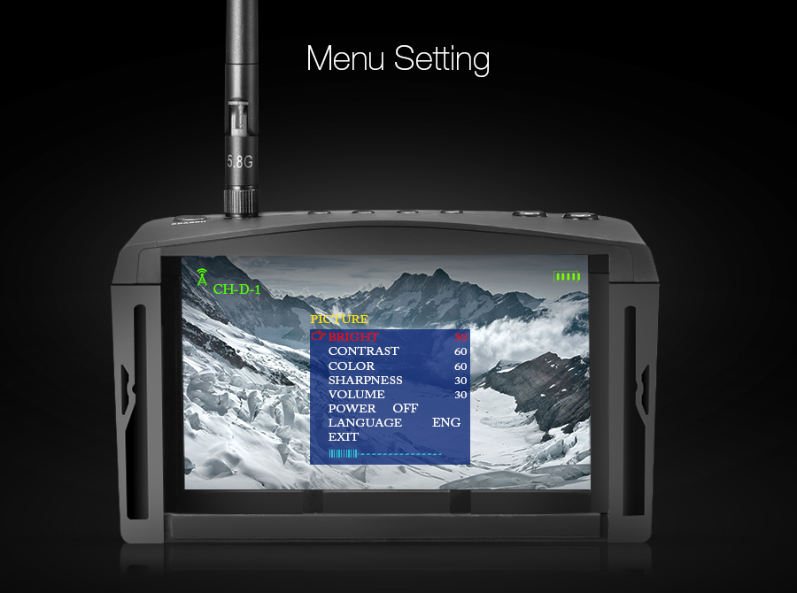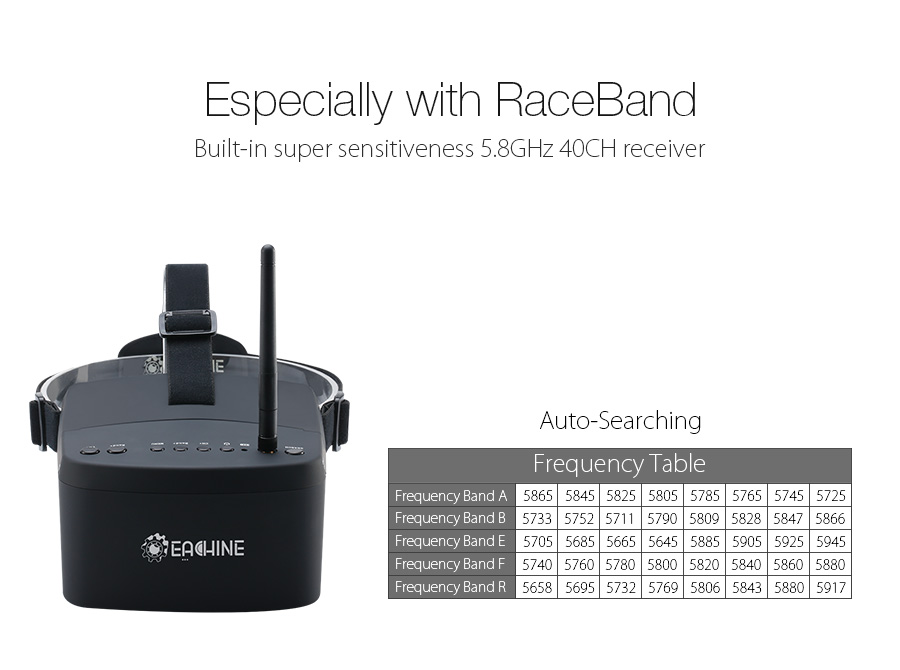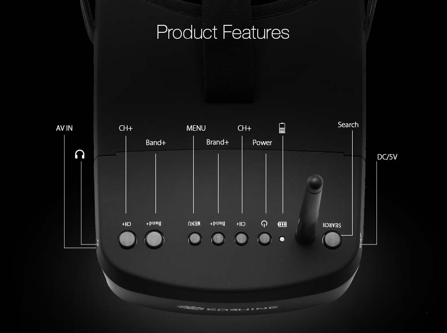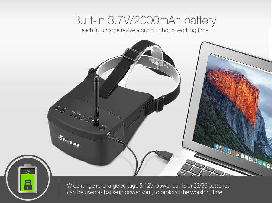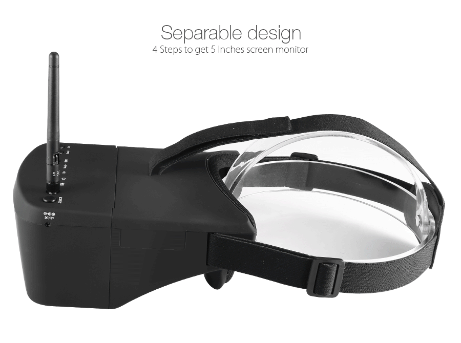 Eachine EV800 bietet ein sensationelles Preis-Leistungs Verhältnis. Mit Ihrem 5" Bildschirm und einer Auflösung von 800 x 480 bei einem Gewicht von lediglich 375 Gramm inkl. Akku ist sie eine echte Alternative zu wesentlich teureren Systemen. Der 40 Kanalempfänger inkl. Raceband funktioniert mit jedem gängigen FPV Sender. Über das mehrfarbige Menü bietet die Eachine EV800 viele Möglichkeiten für eigene Einstellungen. Höchster Tragekomfort dank einem weichen Gesichtspolster. Ein weiteres cooles feature ist die Trennungsmöglichkeit der EV800. Wobei der vordere Teil über einen Schiebemechanismus vom Gesichtsteil gelöst werden kann. Damit kann der eingebaute Monitor auch separat genutzt werden. Etwa um aufgezeichnte Flüge gemeinsam anzusehen oder einfach als FPV Monitor auf einem Stativ. Der integrierte 3,7 Volt Akku mit 2000mAh reicht für rund 3,5 h ungetrübten Flugspass. Reicht dies noch nicht kann der Akku über einen USB Aschluss am Laptop oder am Zigarettenanzünder im Auto wieder aufgeladen werden.