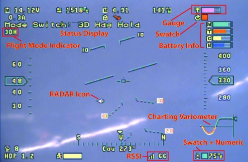 Eine echte Sensation ist auch das bereits integrierte OSD (On Screen Display) in Farbe. Damit werden alle gewünschten Flugdaten wie Fluglage, Höhe, Entfernung, Position, Stromverbrauch, Flugzeit usw. auf einem Monitor oder einer Videobrille eingeblendet.